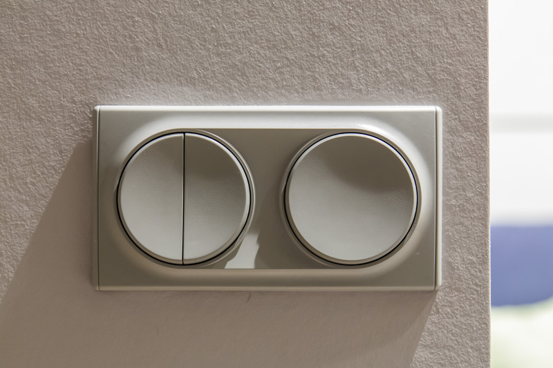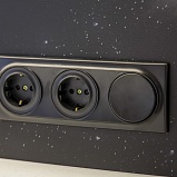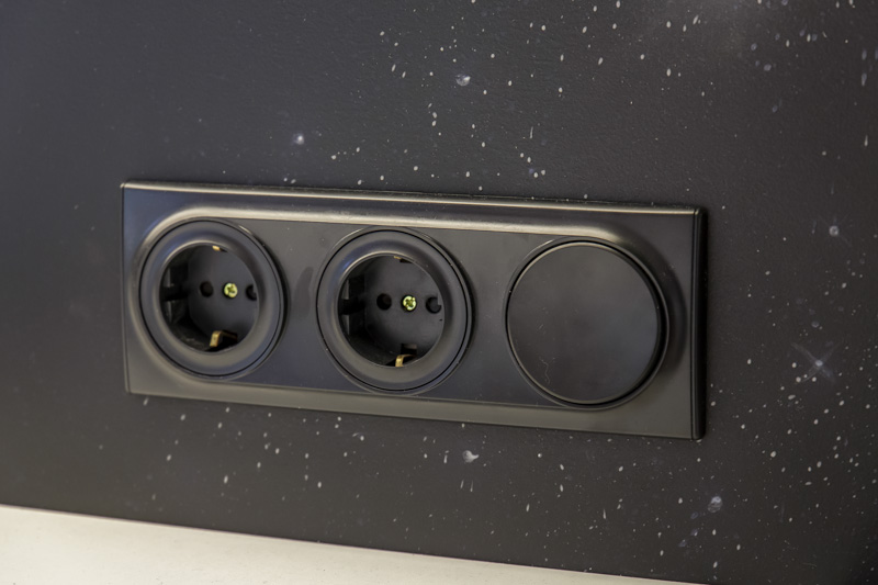 Черный цвет розеток и выключателей, лаконичный дизайн, плавные формы рамок, круглые лицевые накладки гармонично сочетаются с интерьерным решением, предложенным автором проекта. Пластик прокрашен в массе, а значит, цвет изделий сохранится долгое время. Каждая розетка оснащена защитными шторками, которые блокируют доступ к контактам.