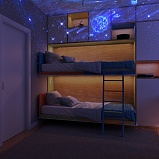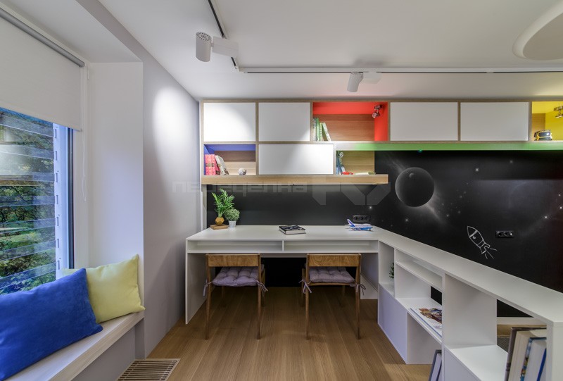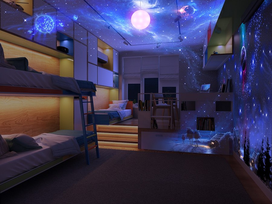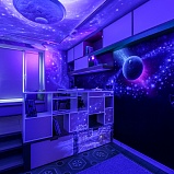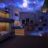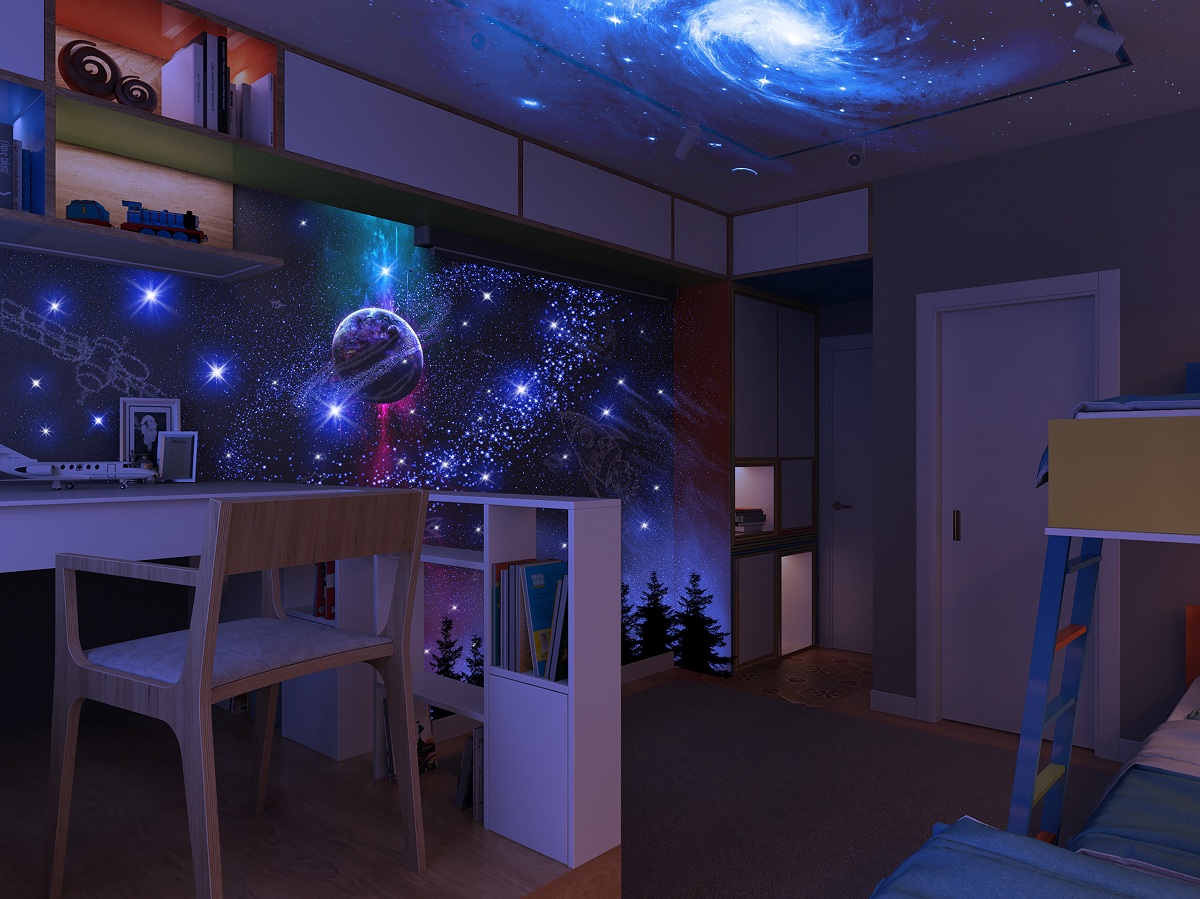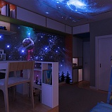 На центральном месте в детской появилось декоративное панно с грифельной доской на всю стену. Здесь установлены черные розетки и выключатель OneKeyElectro, призванные обеспечить безопасное подключение техники. При включении специальных ультрафиолетовых ламп, на доске светятся звезды с планетами. Комната в это время превращается в межгалактический корабль, а маленькие астронавты могут почувствовать себя героями фильма «Стражи галактики».