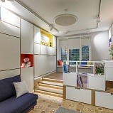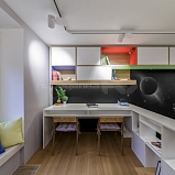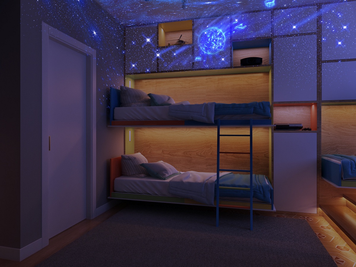 Дизайнер, автор проекта Ангелина Штольц смогла уместить в небольшой по площади детской комнате игровую зону и три спальных места. А поскольку самый старший из ребят готовится к школе, для него она предусмотрела рабочую зону. Для решения этих задач была создана комната-трансформер, в которой все зоны объединились темой космоса. Ведь эта тема интересна всем мальчишкам без исключения!